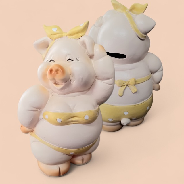 ビキニがお似合いのふっくらぶーちゃん。 縦型なので、存在感はありますがコンパクトに飾ることができます。 体高 15.5cm 材質 レジン 中国製 ___________________ 貯金箱いろいろ https://yukisenli.base.shop/categories/4484790