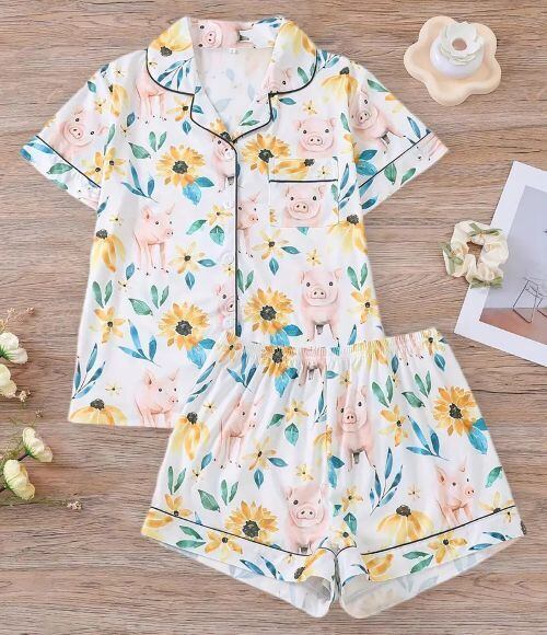 夏に元気になれそうな、こぶたちゃんと黄色いお花柄のパジャマセットです。