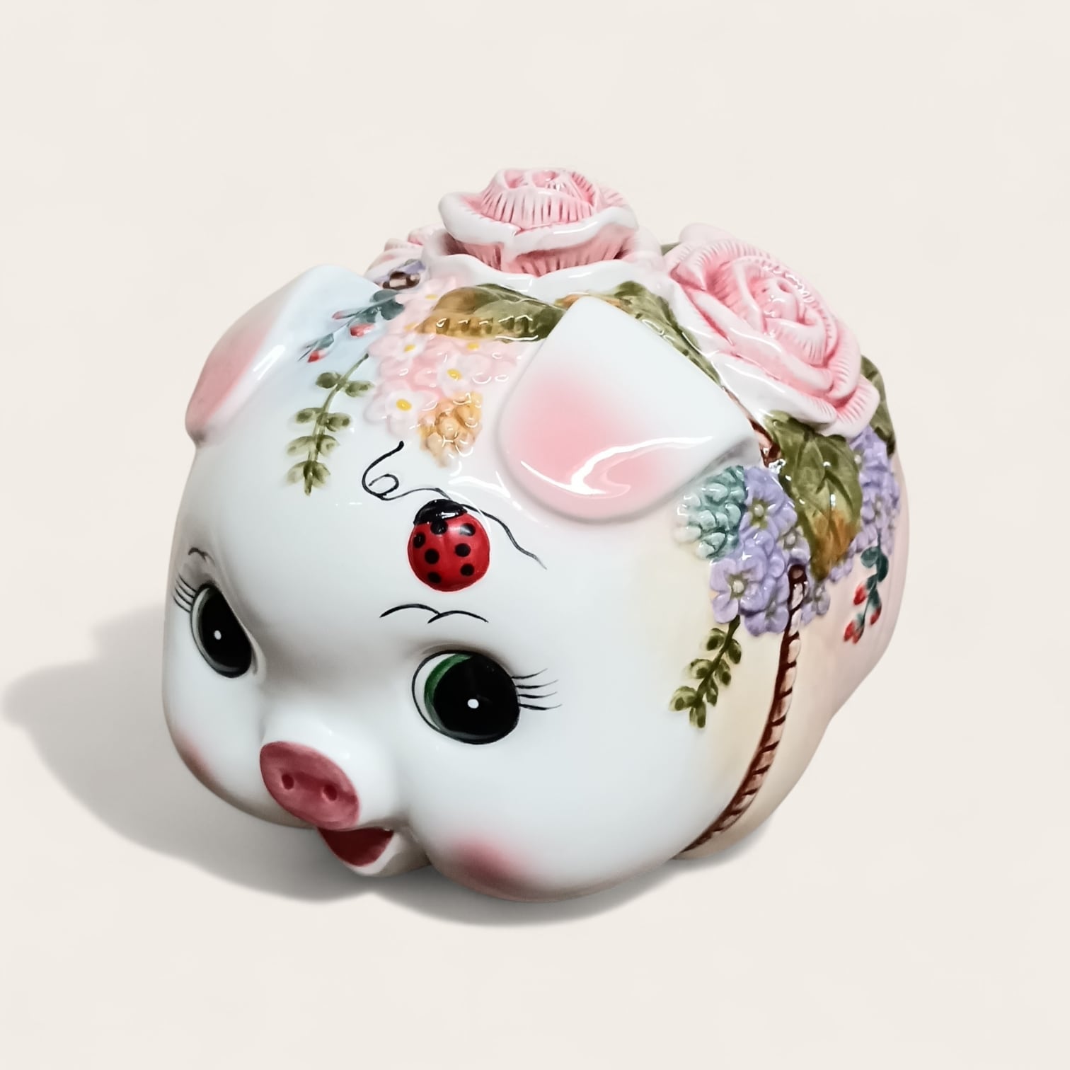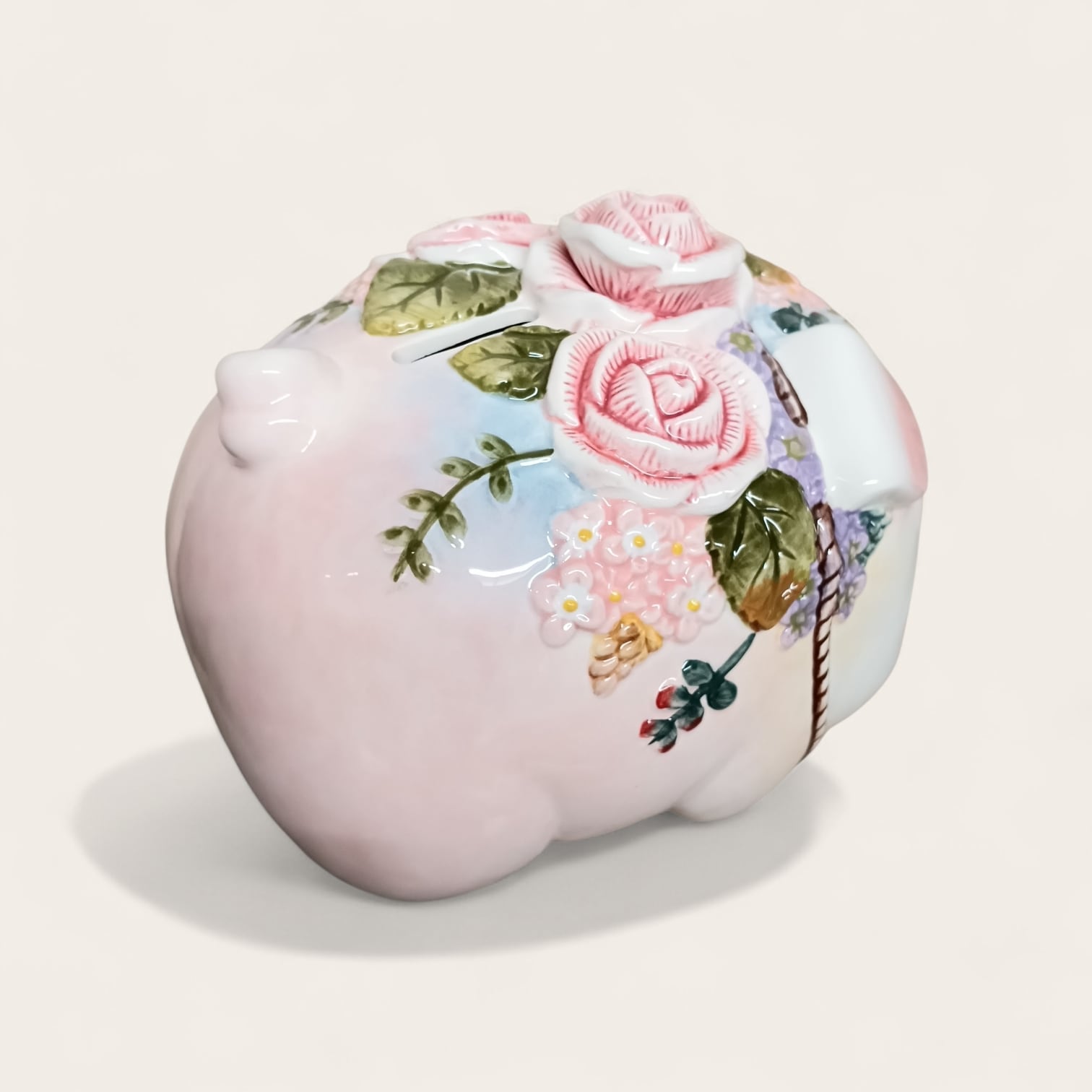 大きく立体的な薔薇と手描きの草花がデザインされたエレガントな花豚貯金箱です。